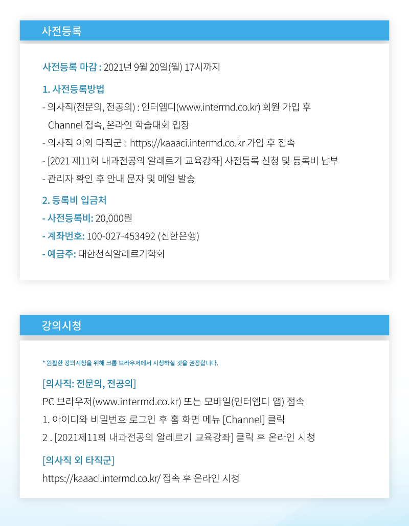 2021 제11회 내과전공의 알레르기 교육강좌 2021년 09월 26일(일)  사전등록 바로가기외부사이트 바로가기