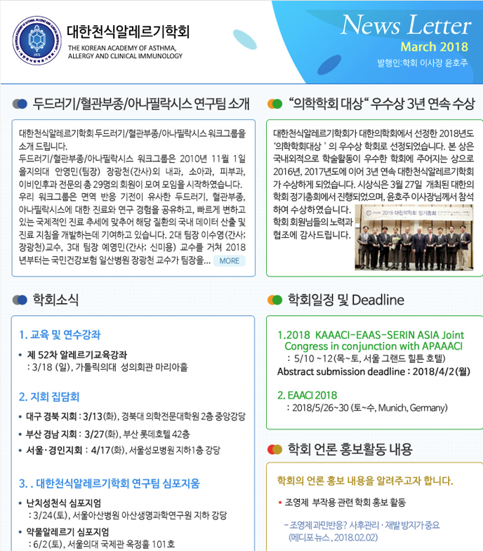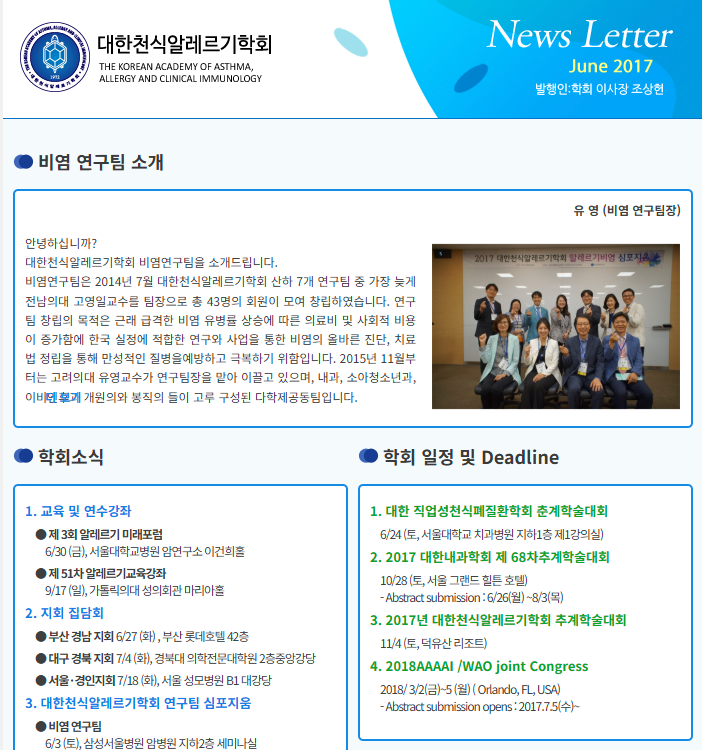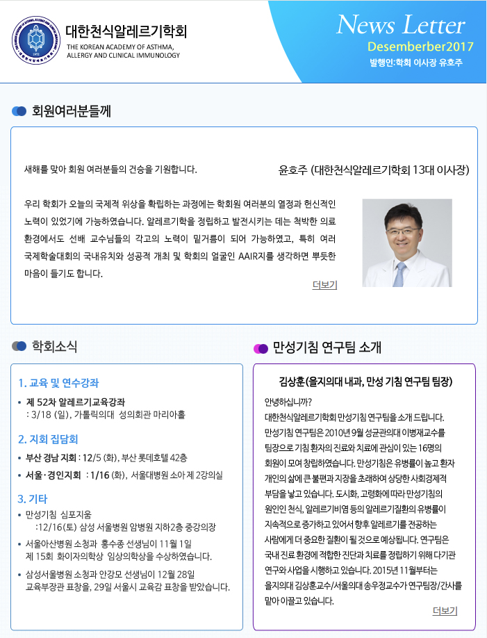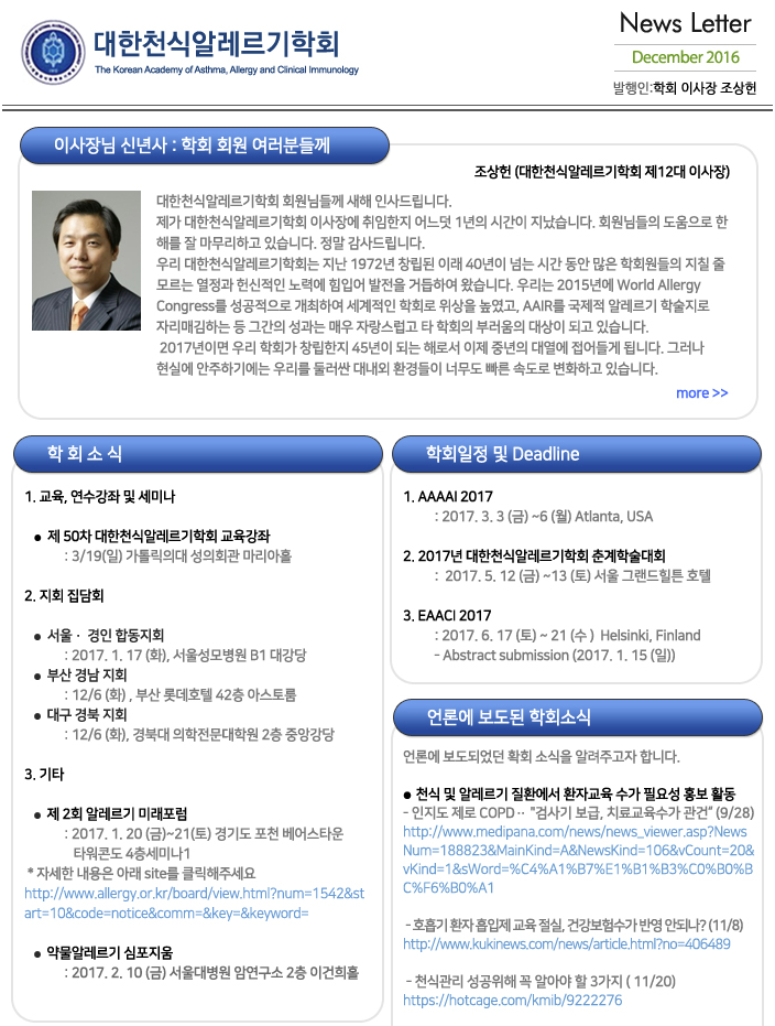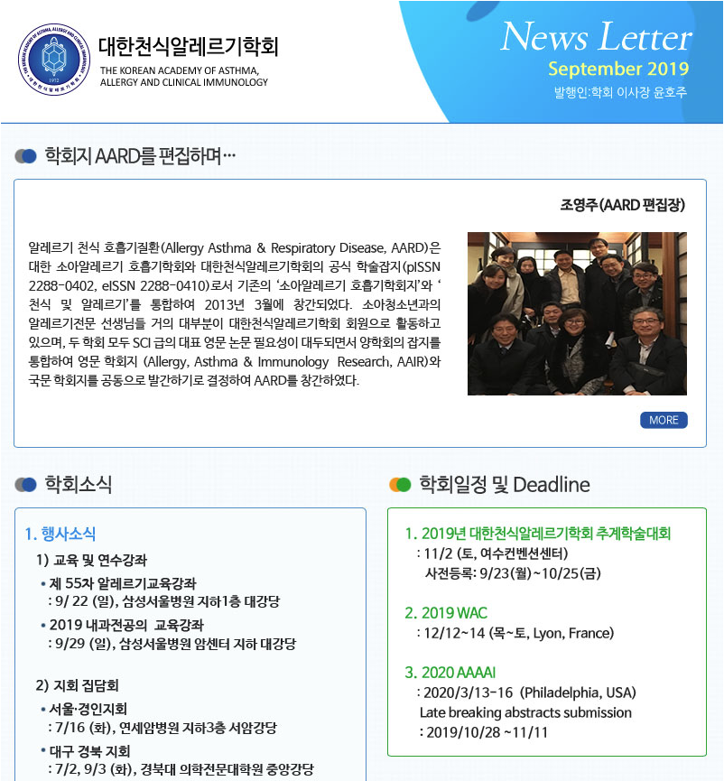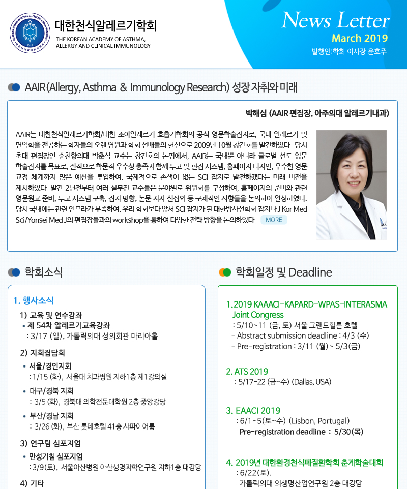 학술지 및 간행 학회소개 학회소식 자료실 학술지 및 간행 학술행사 진료지침 일반인정보 Membership / My Page 뉴스레터 뉴스레터 최신논문소식 교과서 안내 AARD소개 AAIR소개 천식 및 알레르기