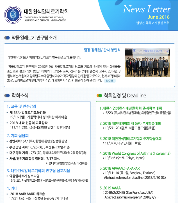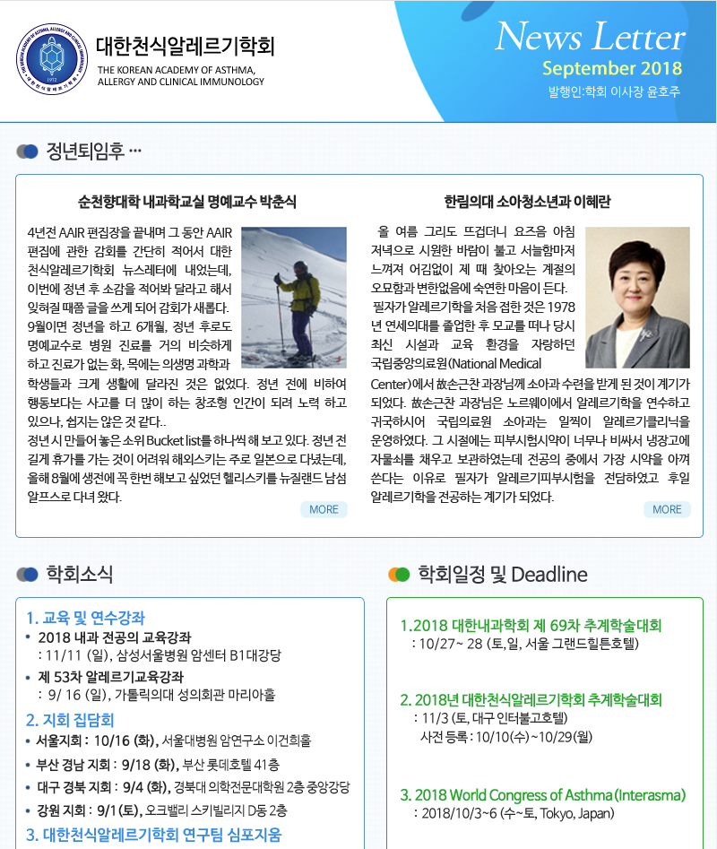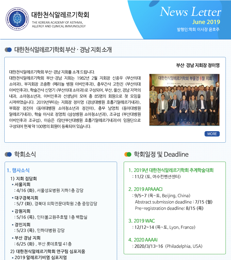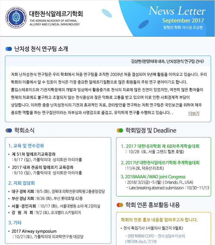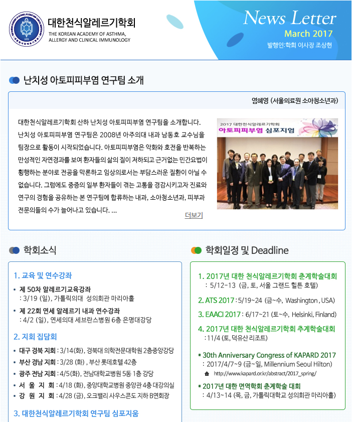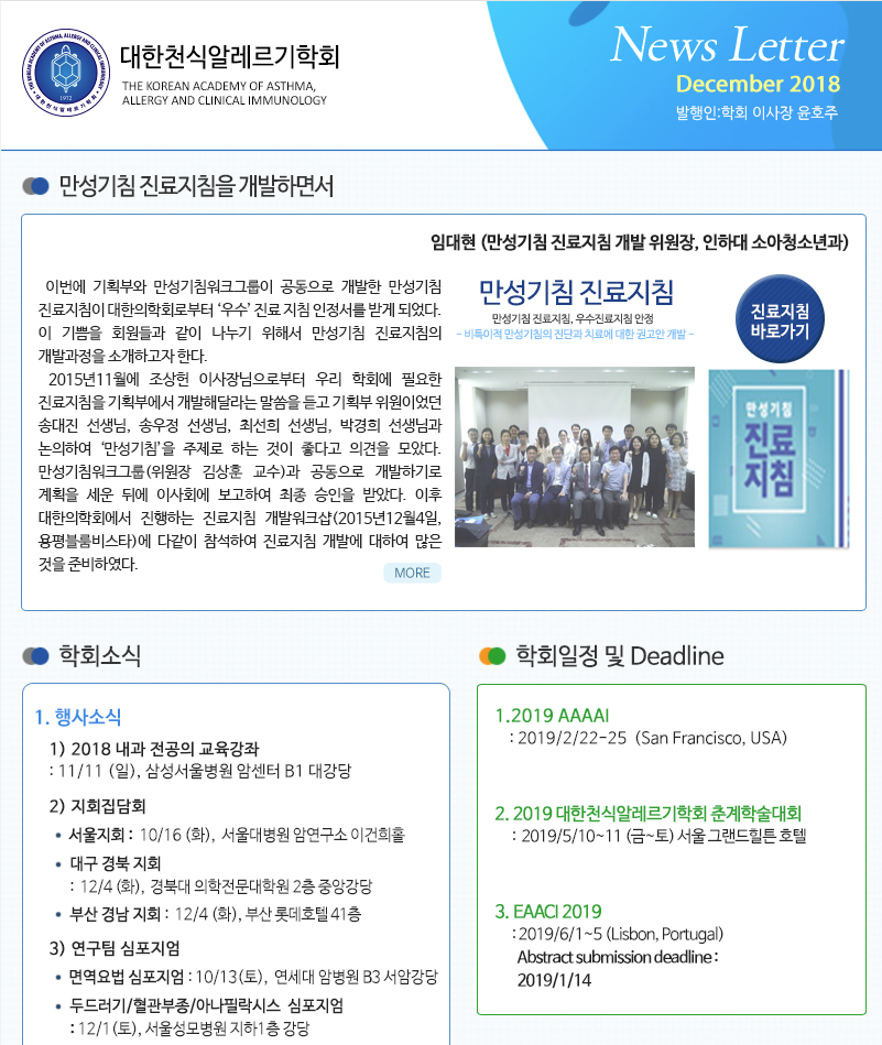학술지 및 간행 학회소개 학회소식 자료실 학술지 및 간행 학술행사 진료지침 일반인정보 Membership / My Page 뉴스레터 뉴스레터 최신논문소식 교과서 안내 AARD소개 AAIR소개 천식 및 알레르기