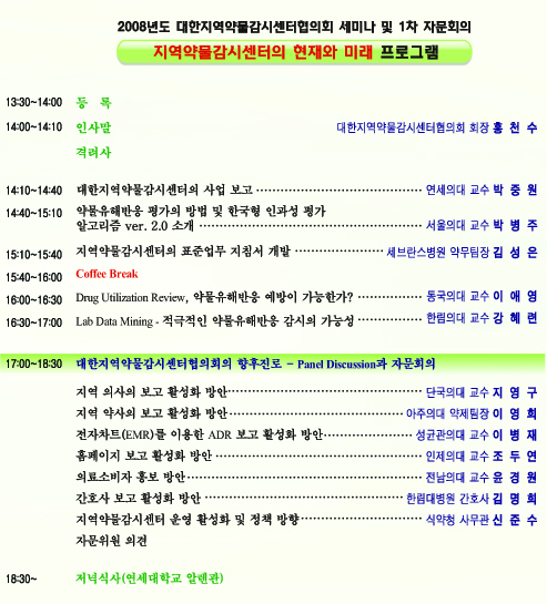 공지사항 6/26 대한지역약물감시센터협의회 세미나 및 1차 자문회의 안내 조회수 : 2,694 게시일 : 2008-06-24 "지역약물감시센터의 현재와 미래" ☞ 일 시 : 2008년 6월 26일(목) 14:00~18:30 ☞ 장 소 : 연세의료원 치과대학병원 7층 강당 ☞ 주 최 : 대한지역약물감시센터협의회 자세한내용은 첨부파일을 확인해주시기 바랍니다. ※ 첨부파일 : 초청장.pdf inv_06242copy.jpg (다운로드 : 0회) 목록