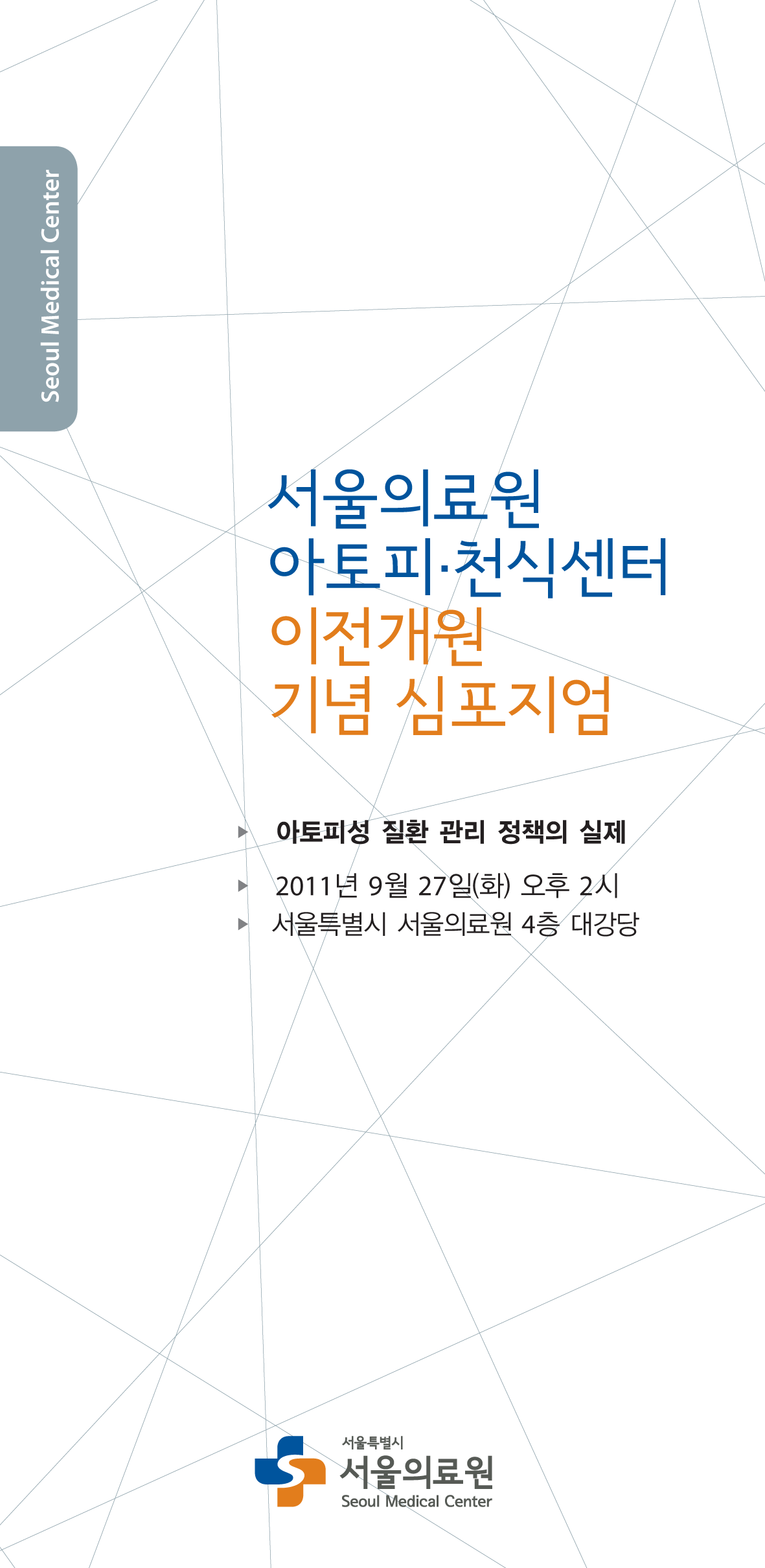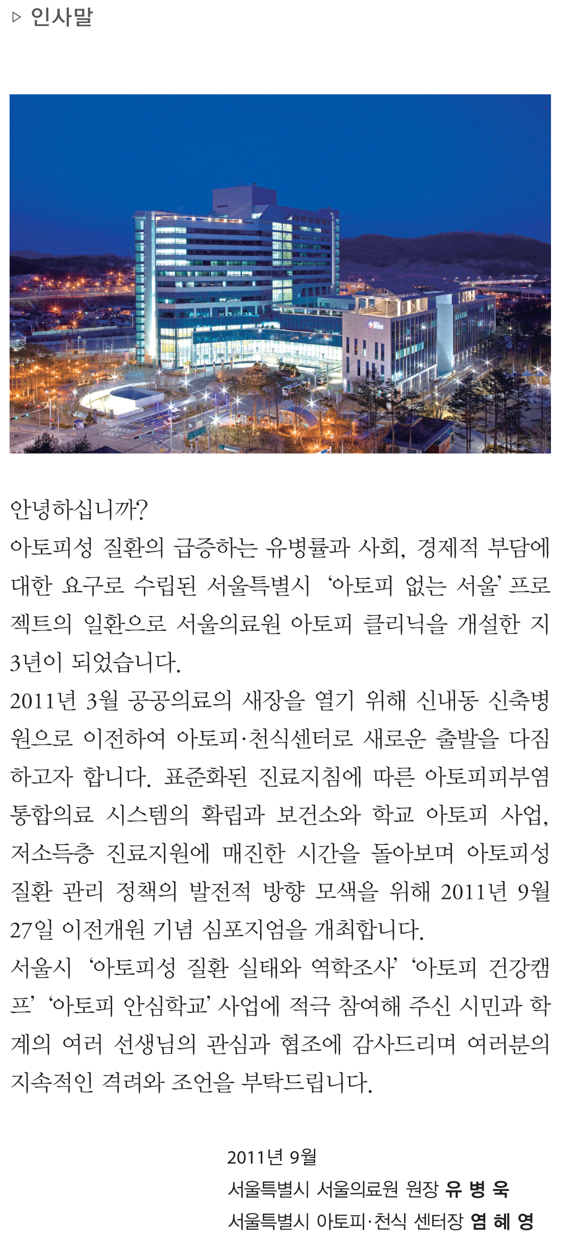 공지사항 서울의료원 아토피·천식센터 이전개원 기념 심포지엄 조회수 : 1,863 게시일 : 2011-09-21 시 간: 2011년 9월 27일(화) 오후2시 장 소: 서울특별시 서울의료원 4층 대강당 110921_1.gif (다운로드 : 1회) 110921_2.gif (다운로드 : 1회) 110921_3.gif (다운로드 : 1회) 110921_4.gif (다운로드 : 1회) 목록