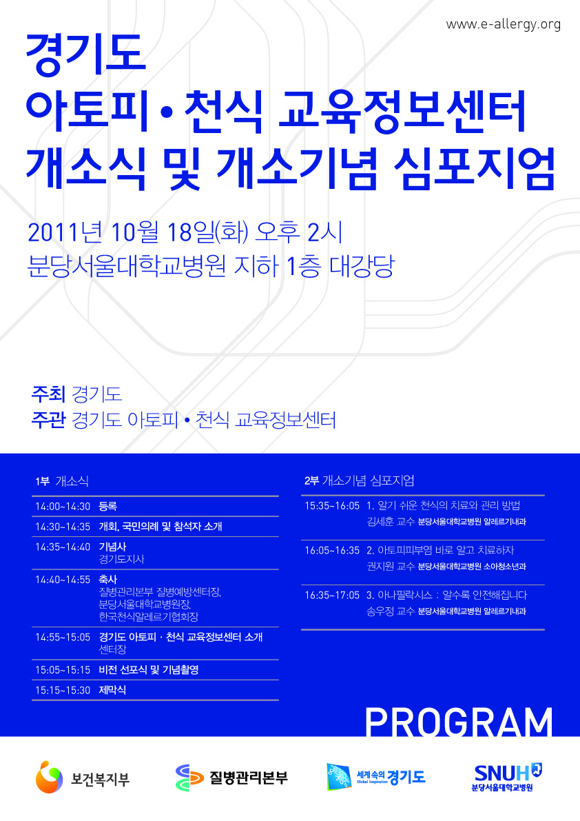 공지사항 10/18 경기도 아토피 천식 교육정보센터 개소기념 심포지엄 조회수 : 1,920 게시일 : 2011-10-13 경기도 아토피 천식 교육정보센터 개소기념 심포지엄 안내 개소식포스터.jpg (다운로드 : 1회) 개소식포스터.pdf (다운로드 : 1회) 목록