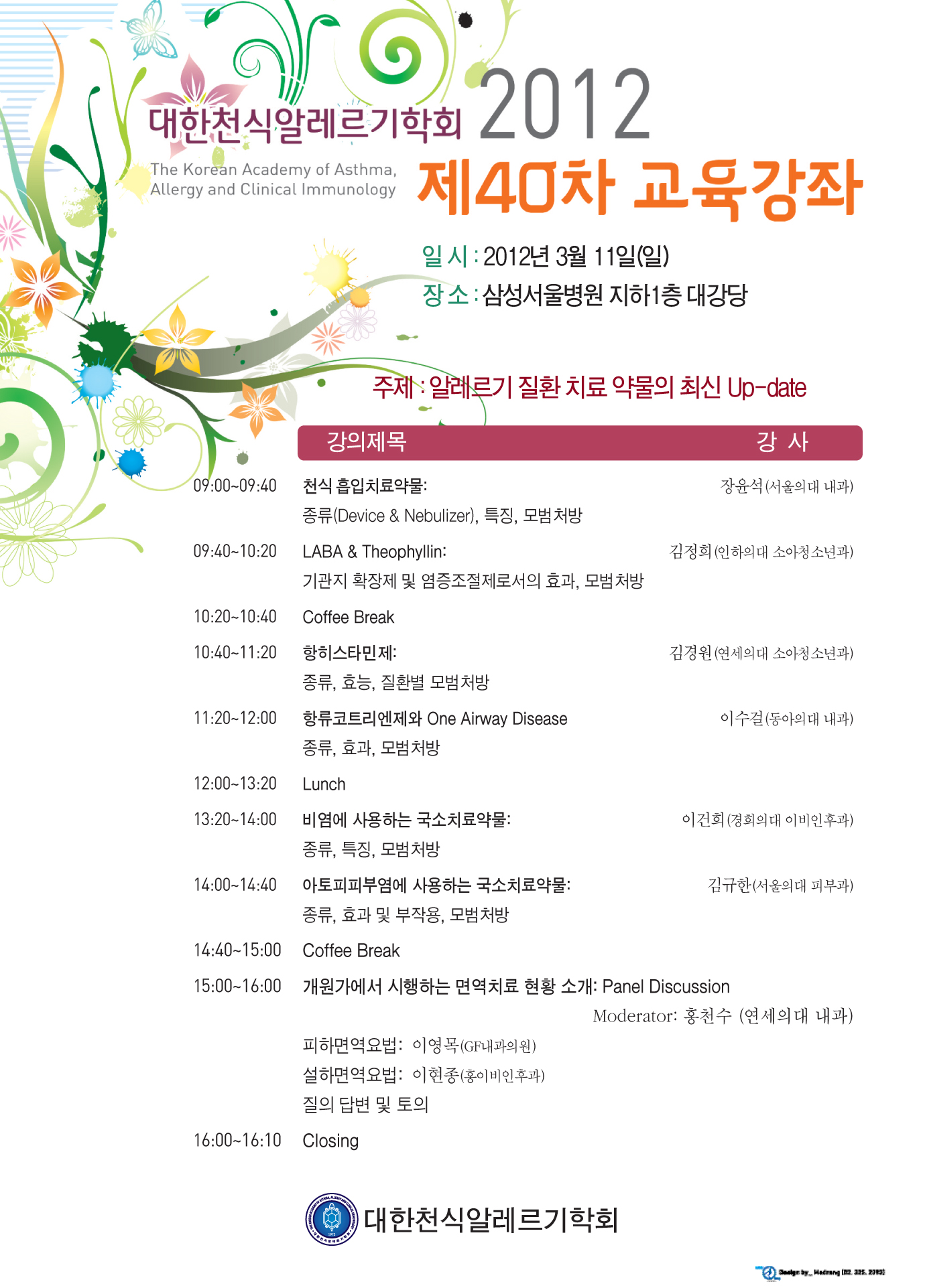 이번 교육강좌에서는 “알레르기 질환 치료 약물의 최신 Up-date”를 주제로 선택하였습니다. 여러 선생님들께 전문가의 생생한 경험을 공유할 수 있는 좋은 기회가 되실 것으로 생각합니다. 바쁘시더라도 부디 참석하셔서 각 질환의 진료 지침에 관해 토의해 주시기 바랍니다.