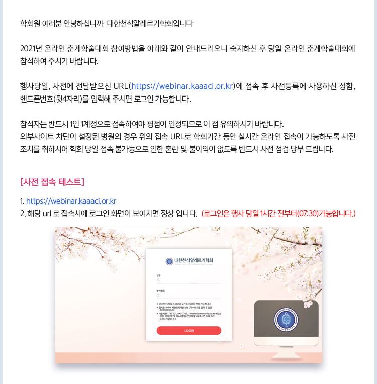 공지사항 2021 대한천식알레르기학회 온라인 춘계학술대회 접속 안내