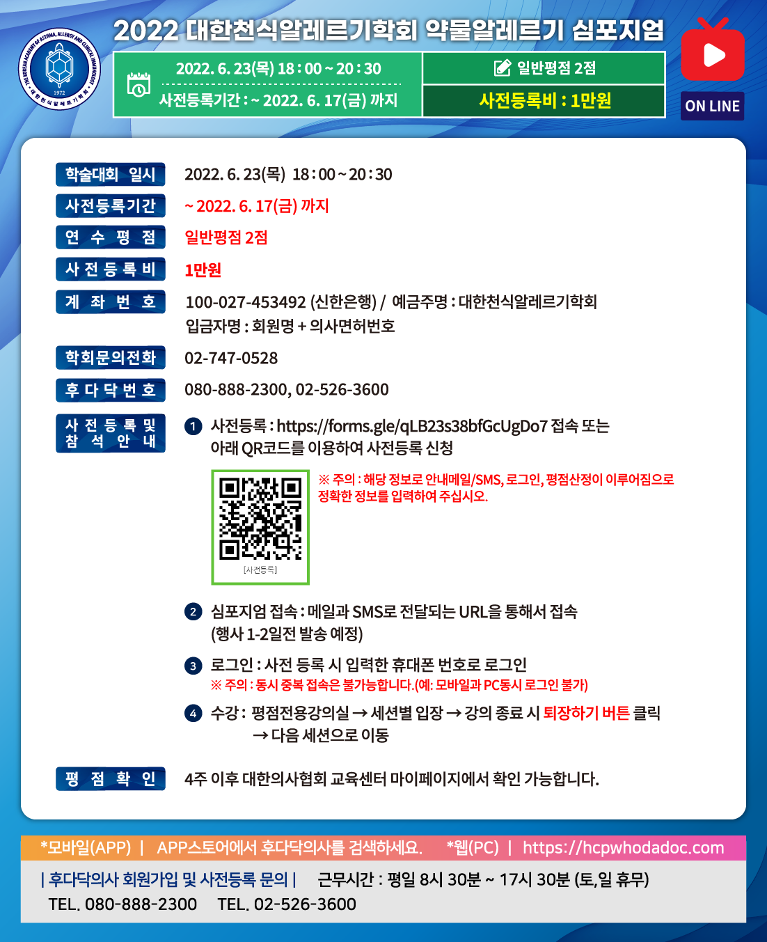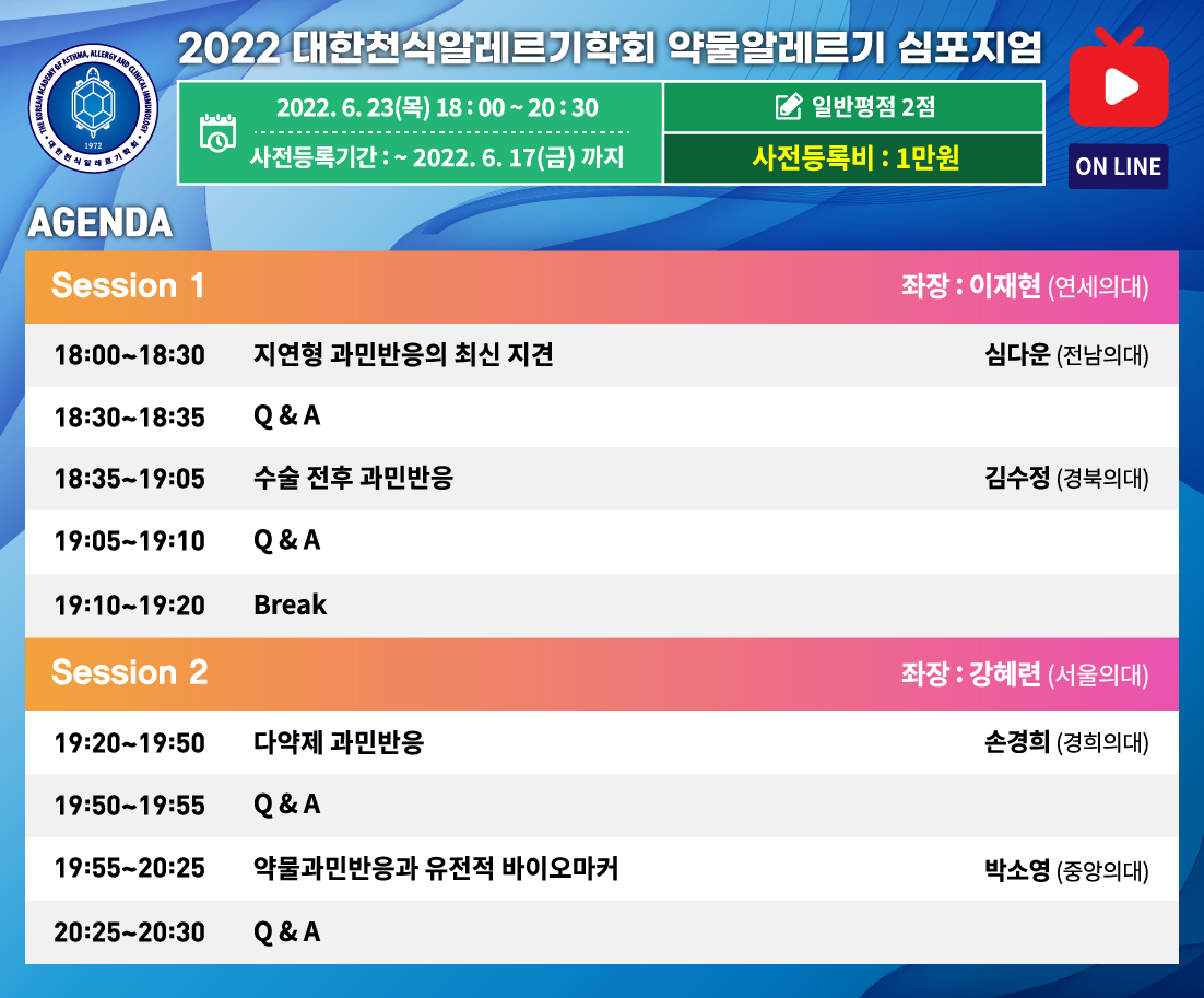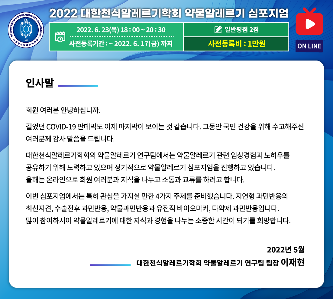 대한천식알레르기학회의 약물알레르기 연구팀에서는 약물알레르기 관련 임상경험과 노하우를 공유하기 위해 노력하고 있으며 정기적으로 약물알레르기 심포지엄을 진행하고 있습니다. 올해는 온라인으로 회원 여러분과 지식을 나누고 소통과 교류를 하려고 합니다.