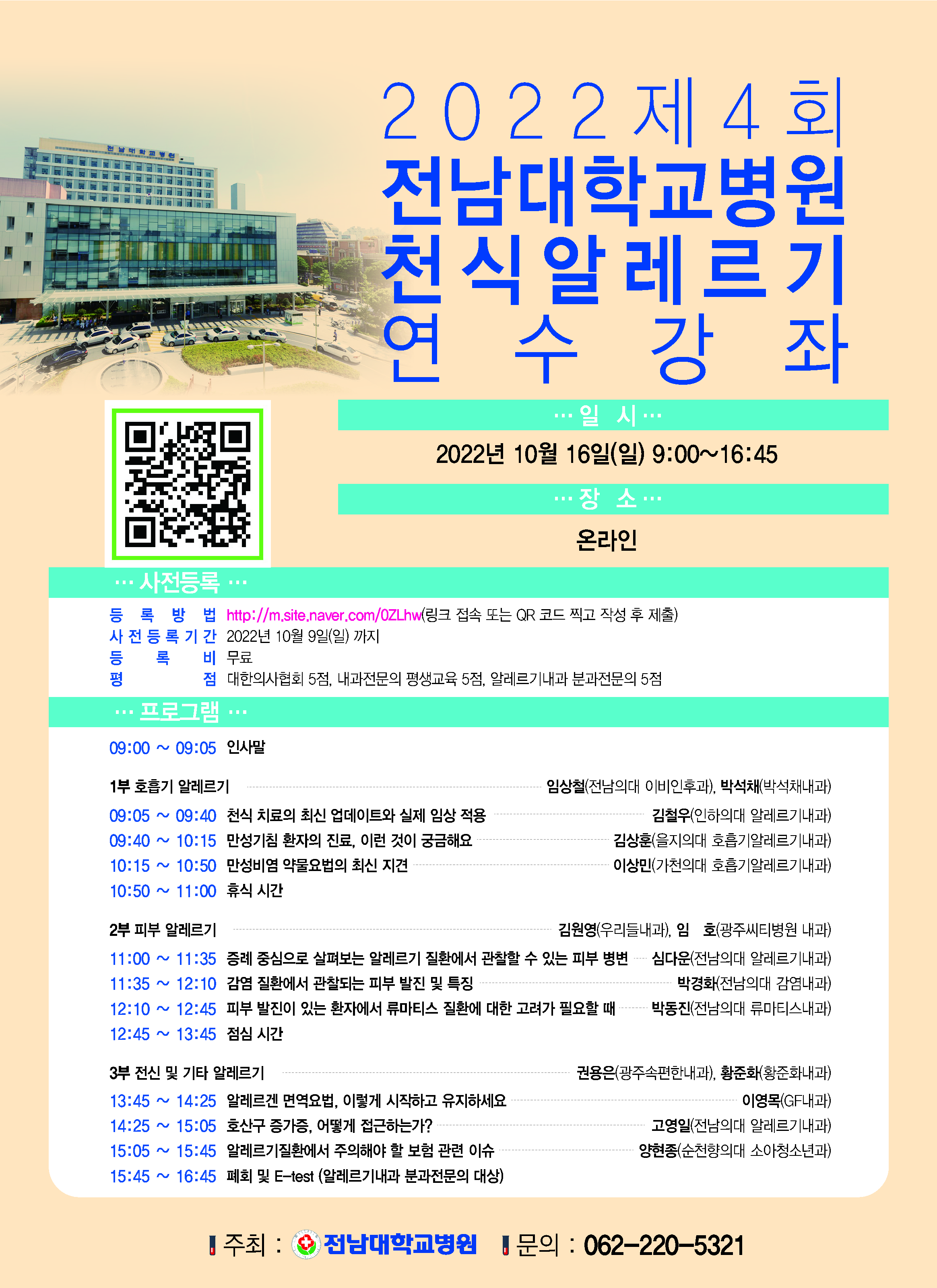 제4회 전남대학교병원 천식알레르기 연수강좌 안내(10.16_온라인)